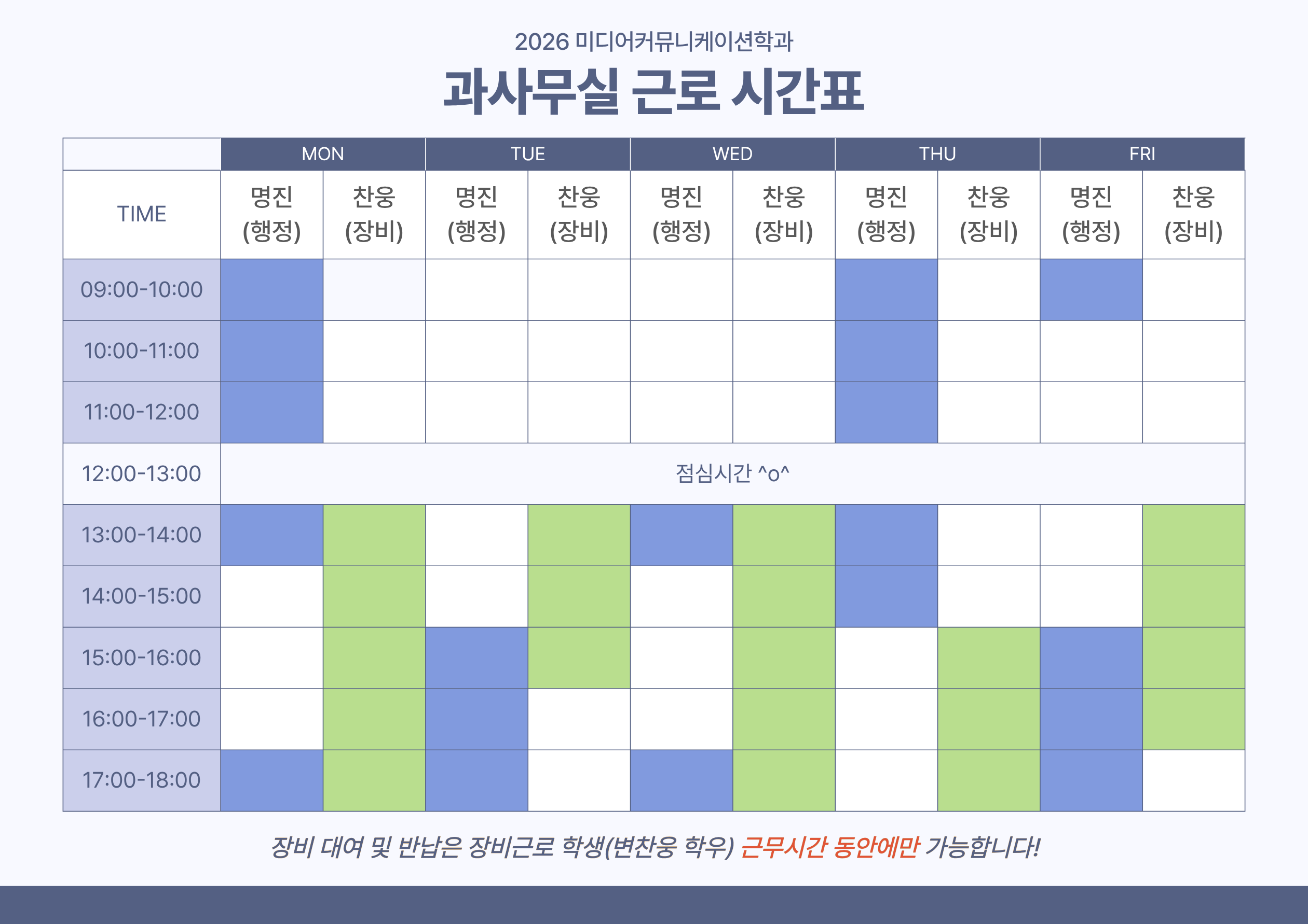 fnctId=bbs,fnctNo=1697 [미디어커뮤니케이션학과] 2026년도 1학기 근로 시간표(장비대여 일정 포함) 글번호 420716 작성일 2026-03-06 수정일 2026-03-10 작성자 미디어커뮤니케이션학과 (032-835-8590) 조회수 314 첨부파일 2026년도 1학기 근로 시간표(장비대여 일정 포함).jpg 다음글 이전글 [셀트리온] 2026학년도 셀트리온복지재단 생활비 장학생 추천 김용준 2026-03-04 10:35:37.0 목록